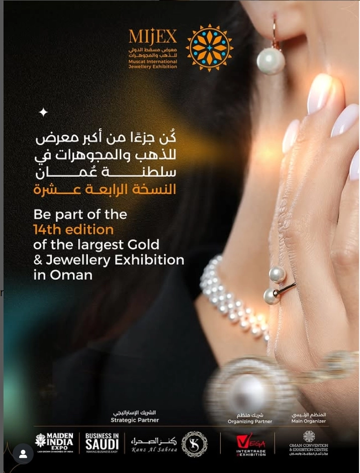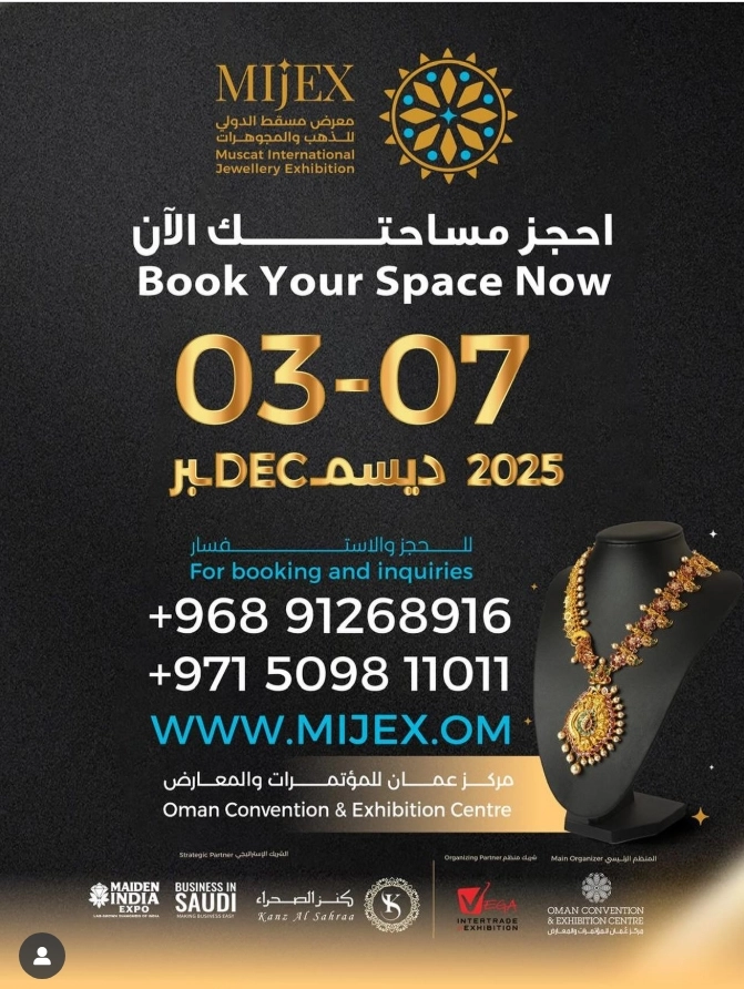 Be sure to join the 14th edition of the Muscat International Gold and Jewellery Exhibition (MIJEX), which will be held at the Oman Convention and Exhibition Centre. Organized by the Centre in partnership with Vega International Exhibitions, this event brings together a selection of local and international exhibitors to offer visitors a unique experience exploring the finest fine jewelry, gemstones, and accessories, featuring both contemporary and classic designs. The exhibition represents a vital platform for enhancing the Sultanate of Oman's position as a prominent regional destination for luxury and innovation, and facilitating fruitful interaction between exhibitors and buyers.